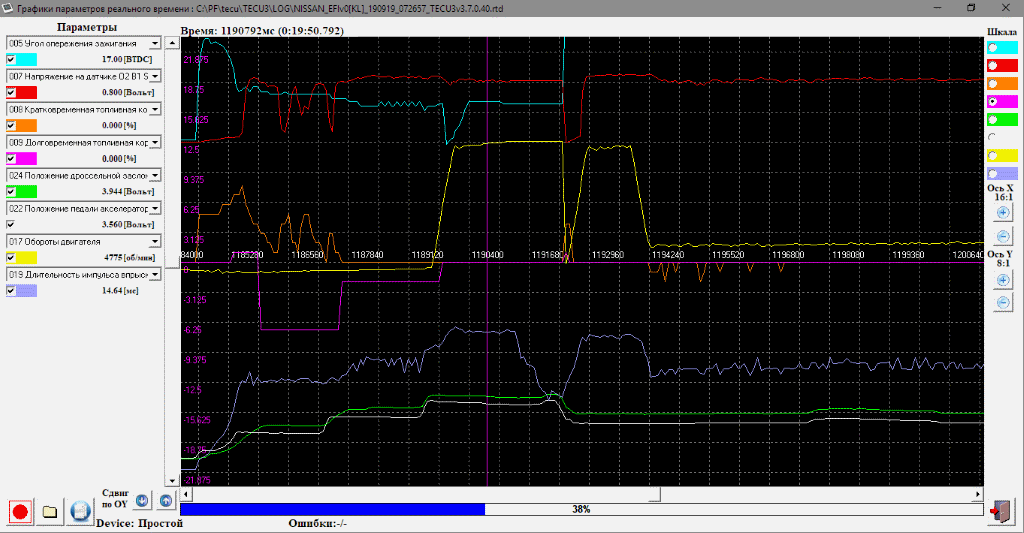 TECU показывает заоблачные значения углов опережения зажигания после фиксации ошибки. Скорее всего верить им нельзя, т.к. считаются они от сигнала датчика коленвала, а он выдает некорректный сигнал.
