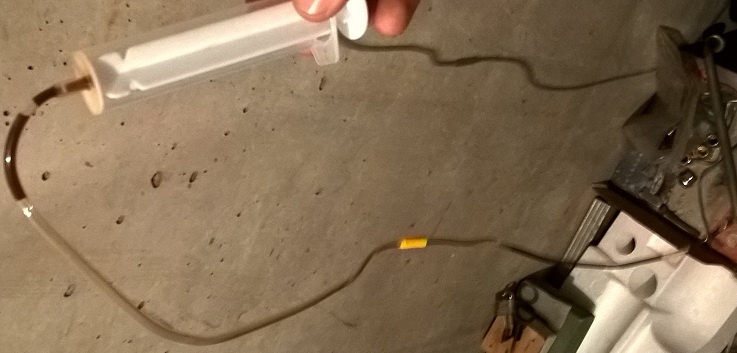 2. Капельница + шприц (всего на 20 мл. удалось найти). Жёлтая изолента на длине равной длине щупа: