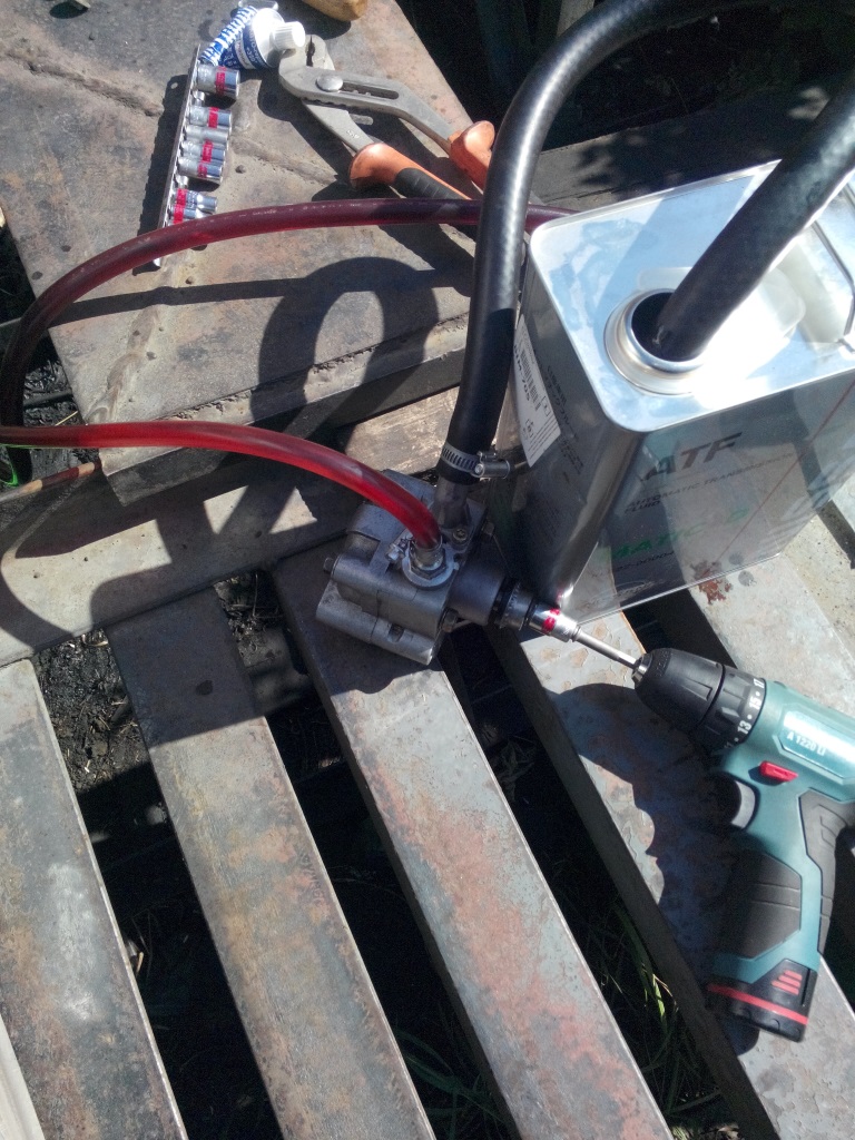 На этот раз применил иной, правильный метод подачи свежей жидкости в коробку. Для этого применил купленный ранее насос: