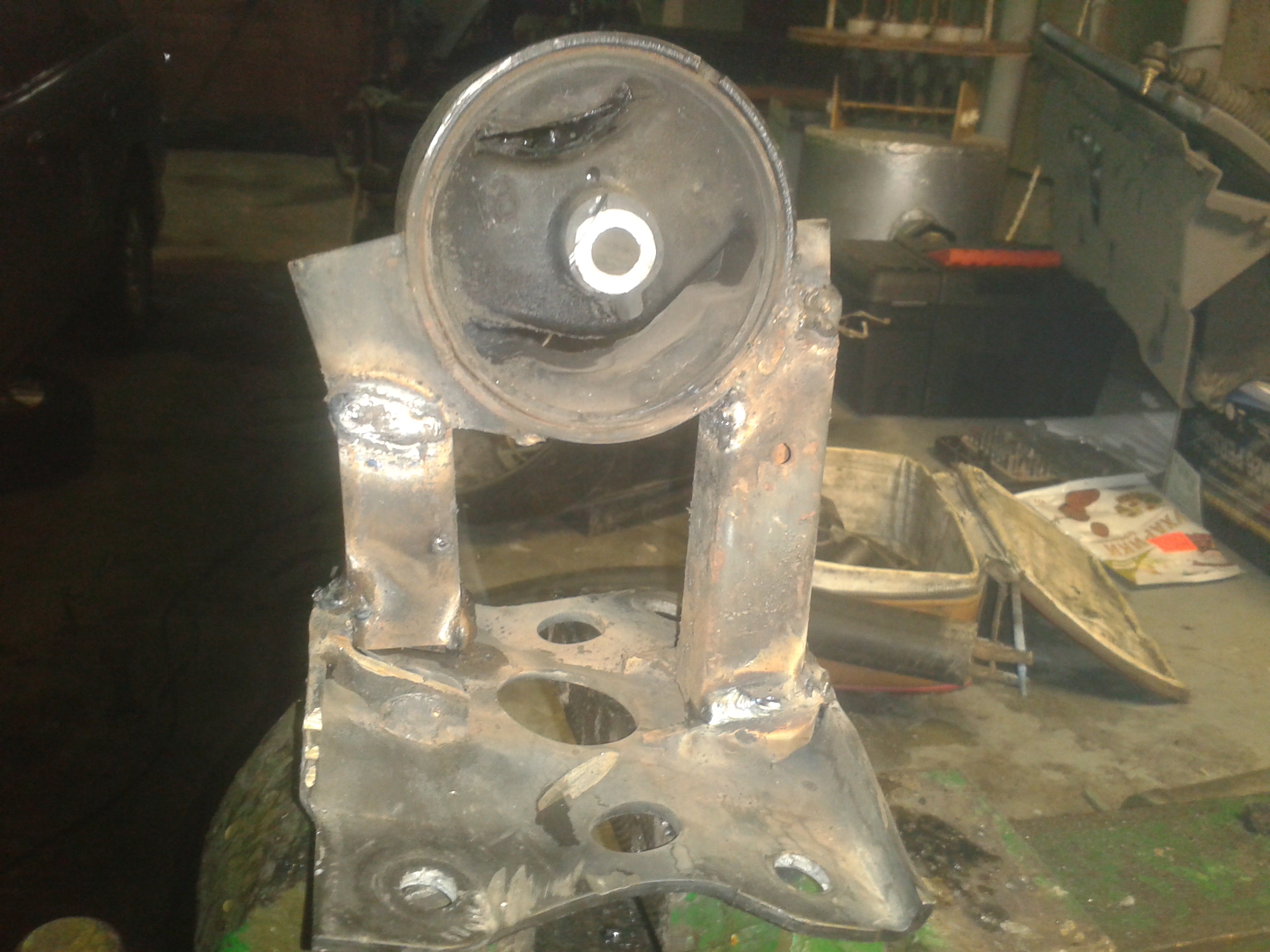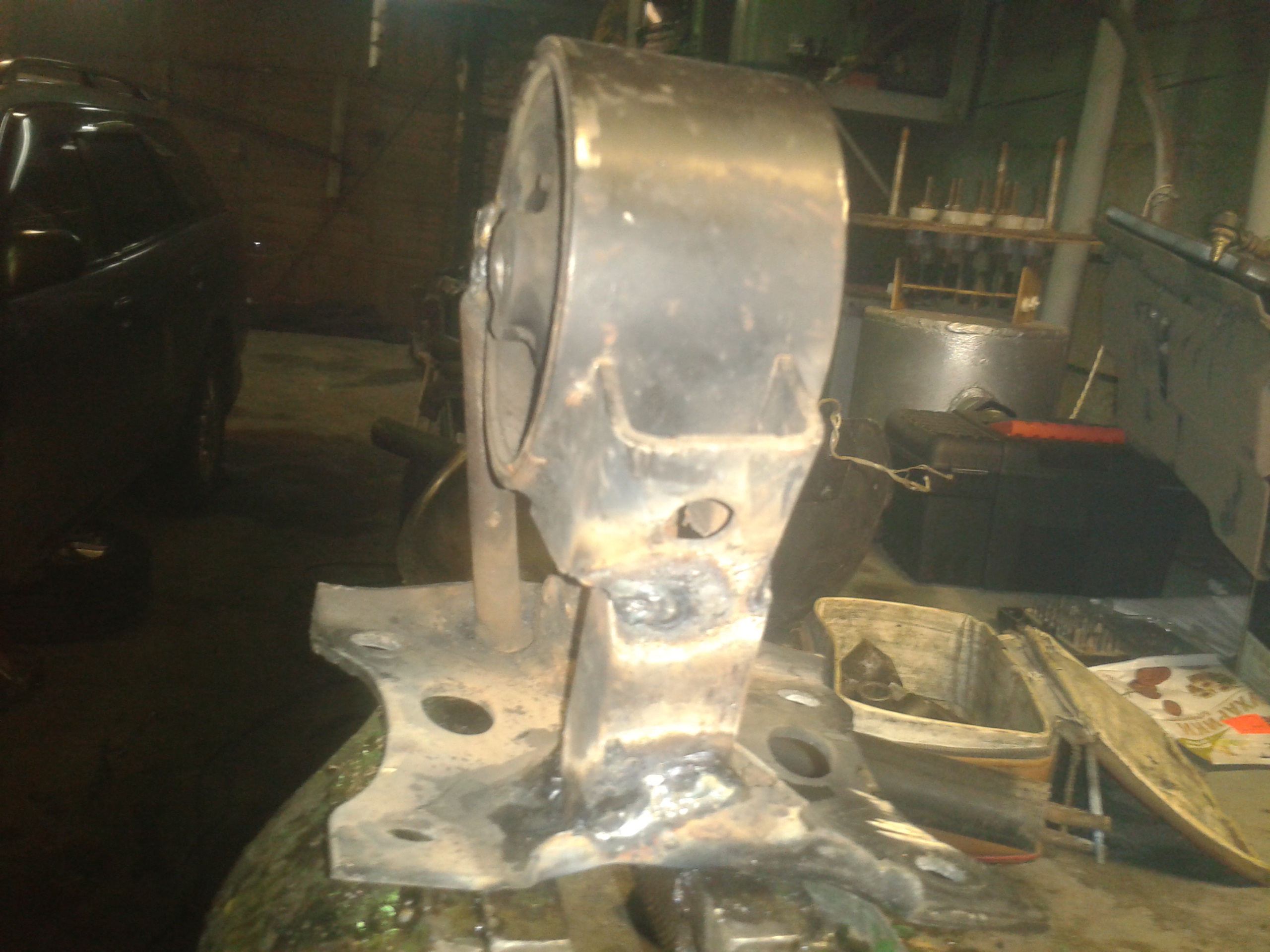 7. Ставим подушку (подушка ставиться снизу), а отрезанное крепление прикручиваем к АКПП. Получается разбег в 10см от подушки до крепления, и 1,5см влево. Взяв металлический прут длинной 20см, соединяем подушку и крепление, прихватываем с двух сторон сваркой (я варил обычной дуговой, электродом 3). Снимаем и получаем крепление с подушкой, остается только усилить. Я использовал профтрубу квадратную.