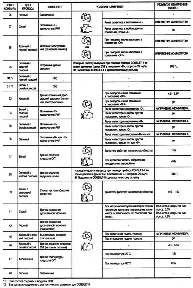 Прошу модераторов сделать тему ВАЖНОЙ! Так как в новом форуме появились новые возможности, а материалов у мну накопилось уже предостаточно, так что спешу поделиться этой инфой. Да и форумчанам не придется перелопачивать и просеивать кучу ненужной инфы, так как все будет лежать в одном месте. И так начнем: 1. Диагностика: Первым делом необходимо убедиться, что TPS правильно установлен, ( его не крутили и он исправен ). Для этого желательно иметь сканер, который читает хотя-бы DATA STREAM с мотора. На сегодня – это делают самые завалящие сканера. Необходимо проверить – уровень сигнала TPS , а также состояние сигнала IDL . TPS – 0.4 v- 0.5 v , IDL - closed ( ON ) . Без сигнала IDL самодиагностика может не запуститься. !! Сигнал IDL может формироваться отдельной контактной группой IDL – FULL THROTTLE ( 6 –ти контактные TPS ,например RB25 , SR20 моторы ), а так-же и трех контактным TPS по уровню 0.4 вольт. ( моторы GA , GC ). Проверить уровень можно тестером. Можно на работающем моторе снять коричневую фишку – обороты ХХ должны упасть не более чем на 100 , подсоединить обратно – ХХ должен остаться в норме. Если нет – проверяйте TPS , или обучайте ECU уровню ХХ.( idle volume learning ) На некоторых свежих моделях ( например SERENA с SR20DE ) может стоять система облегчения пуска, которая реализована в виде подпружиненного штока , приоткрывающего дроссельную заслонку на небольшой угол. С другой стороны этот шток связан с вакуумным сервоприводом , разряжение для которого берется из за дроссельного пространства. Иными словами – если мотор заглушен – то заслонка приоткрыта и контакт IDL разомкнут. Самодиагностику не сделать. После запуска , разряжение через диафрагму втягивает шток , и заслонка встает на собственный упор корпуса. В такой системе необходимо либо снять этот привод , либо подав вакуум с ручного манометра освободить ход заслонки, чтобы контакт IDL замкнулся . Заслонка должна упираться в свой ограничитель закрытого состояния. Перед диагностикой мотор и трансмиссия должны быть прогреты в движении. Некоторые мануалы требуют подключения CONSULT и проверки датчика температуры в АКПП – напряжение должно быть меньше 0.9 Volt . Практически это выглядит так – машина должна проехать несколько км, перед приездом к вам. Последовательность действий при самодиагностике. 1. машина прогрета в движении 2. отключены все потребители, как фары , обогрев стекол , кондиционер итд 3. аккумулятор исправен, напряжение больше 12 вольт 4. Нет сигнализаций, разрывающие штатные цепи. 5. селектор передач в положении P Порядок проведения 1. вставить ключ в замок, повернуть из положения выключено ( OFF) в положение включено ( ON )- когда загораются контрольные лампы на панели приборов ( следующее положение - старт, OFF - это положение ACC ) так сделать два раза ( OFF - ON , OFF - ON - OFF )оставить выключенным ( сделать быстро ) 2. селектор передач в положении P - включить зажигание в ON , подождать когда загорится лампа CVT ( SPORT ) на две секунды , сразу выключить зажигание ( OFF ) 3. нажать педаль тормоза и перевести селектор передач в положение D 4. включить зажигание ON 5. отпустить педаль тормоза и перевести селектор в L 6. одновременно полностью до упора нажать педали тормоза и газа и не отпуская их перевести селектор в D 7. отпустить обе педали Сначала идет стартовый импульс 2 секунды ( аналогично при включении зажигания – если все исправно ), потом лампа замигает 10 раз , при этом надо с