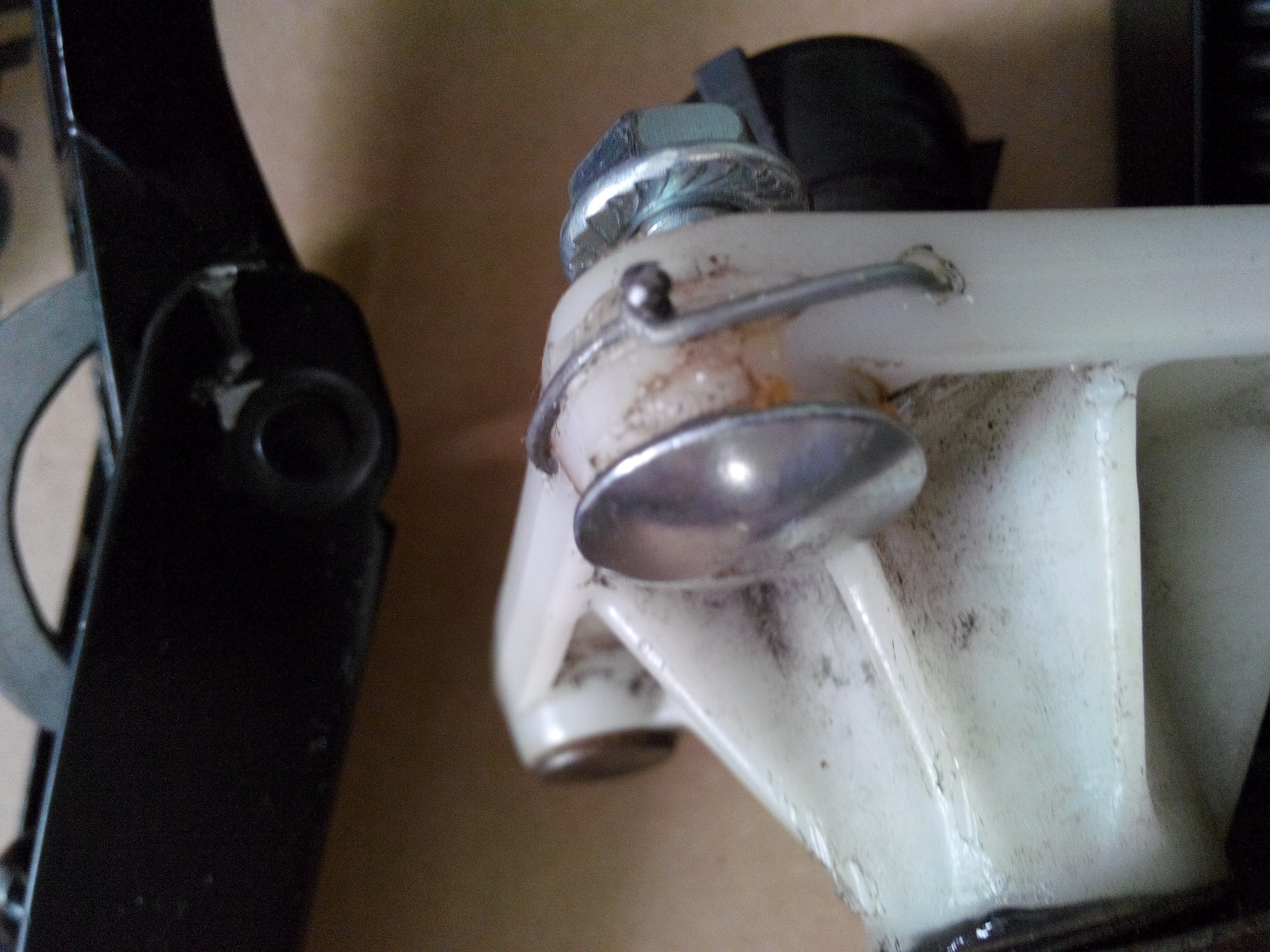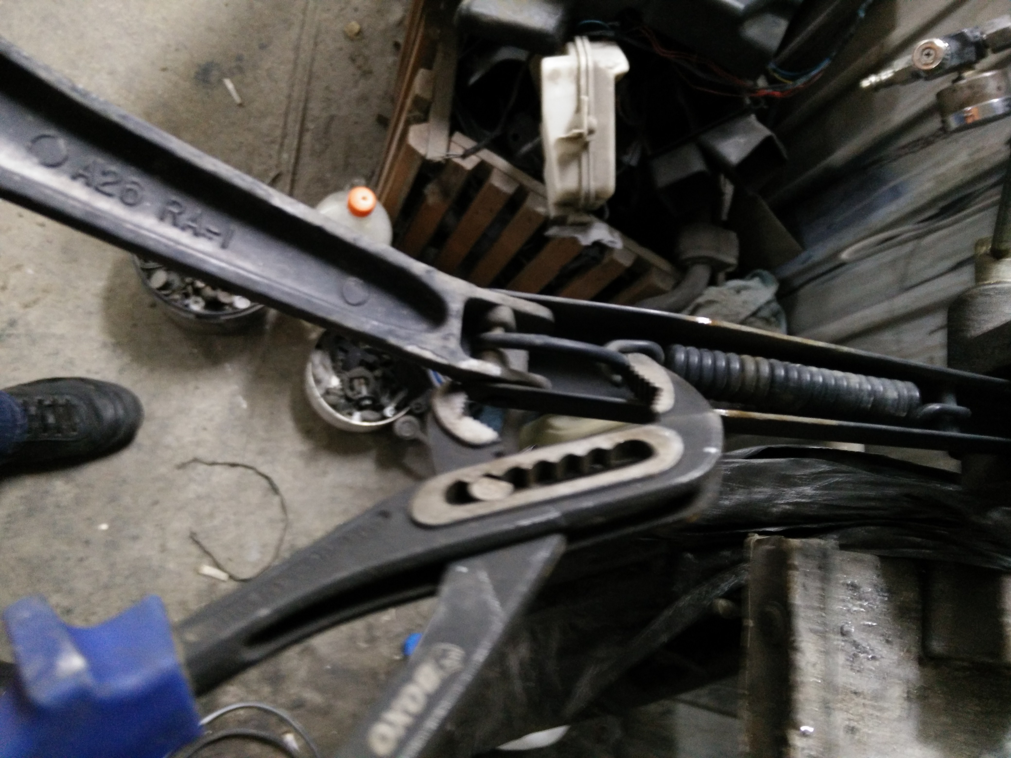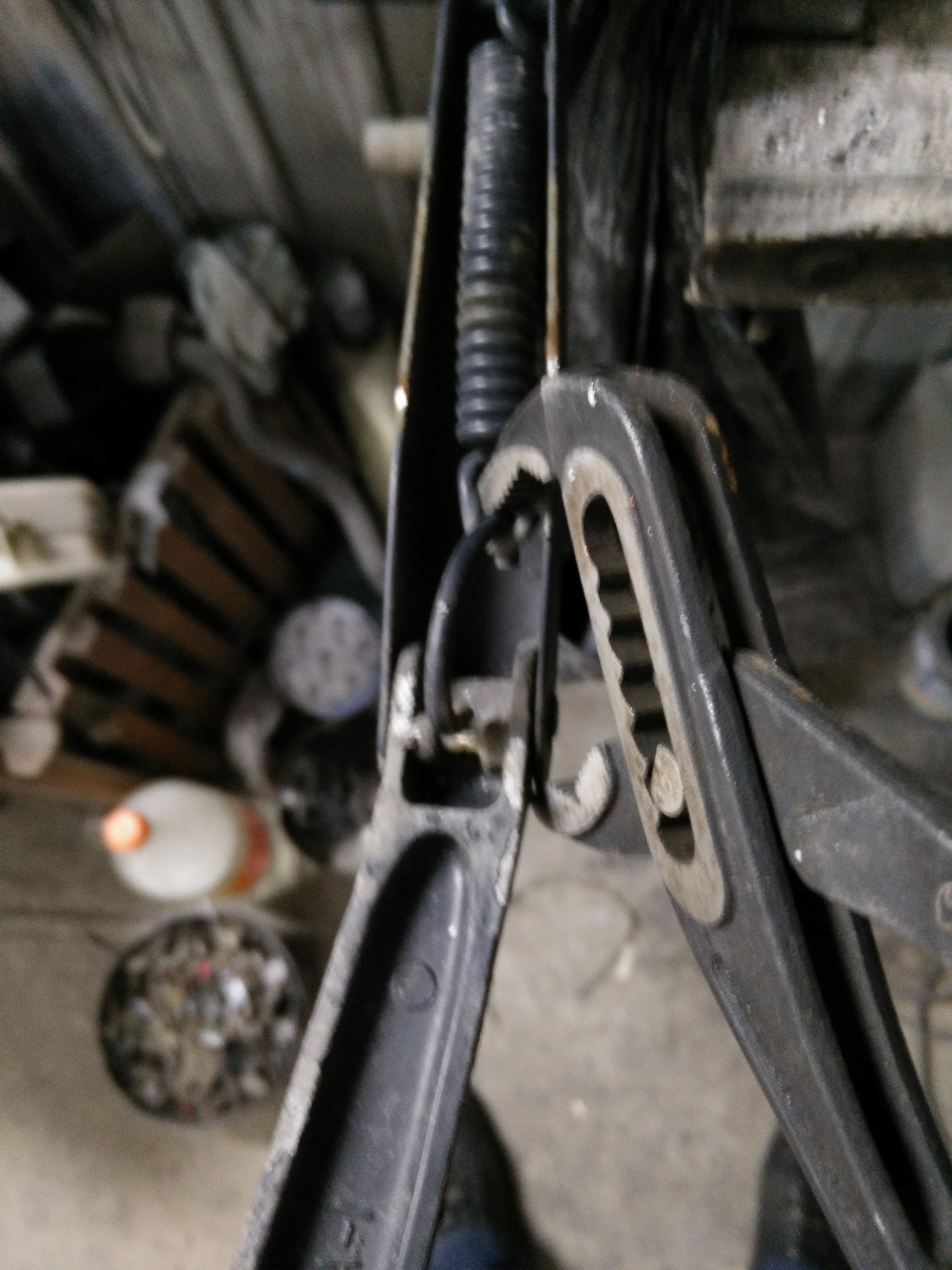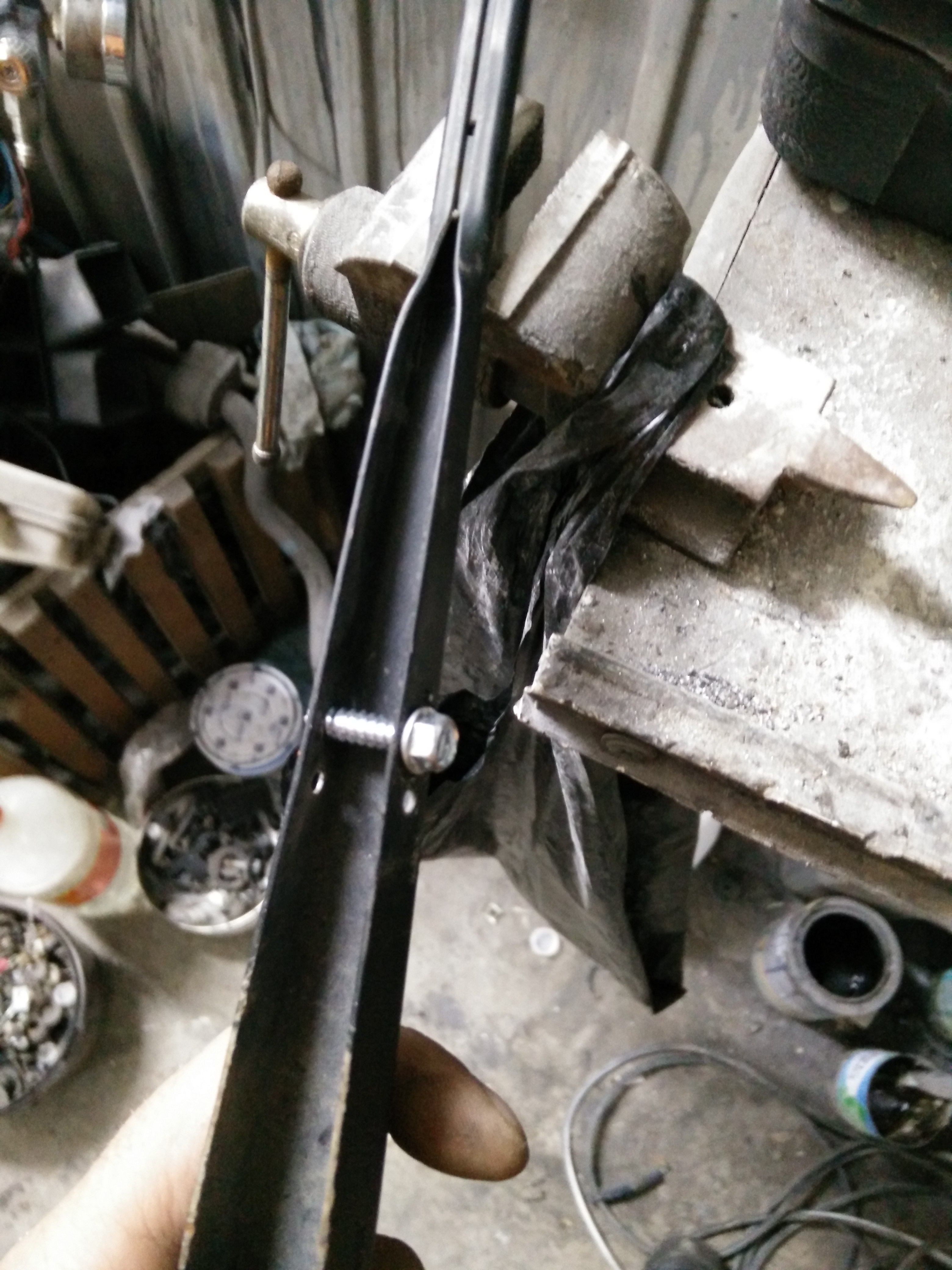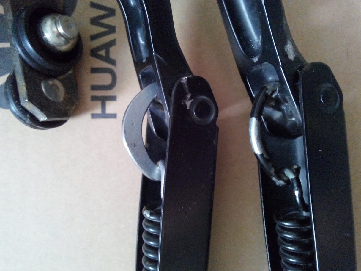 Сделал одну плоскую скобу, взамен родной проволочной, чисто для эксперимента. Толщина штатной проволочной скобы всего 3,5мм, усилием пружины она разгибается, ослабляя натяг. Новая плоская имеет толщину 2,5 мм, зато высота профиля в самом нагруженном месте почти 7 мм, так что не разогнется точно.