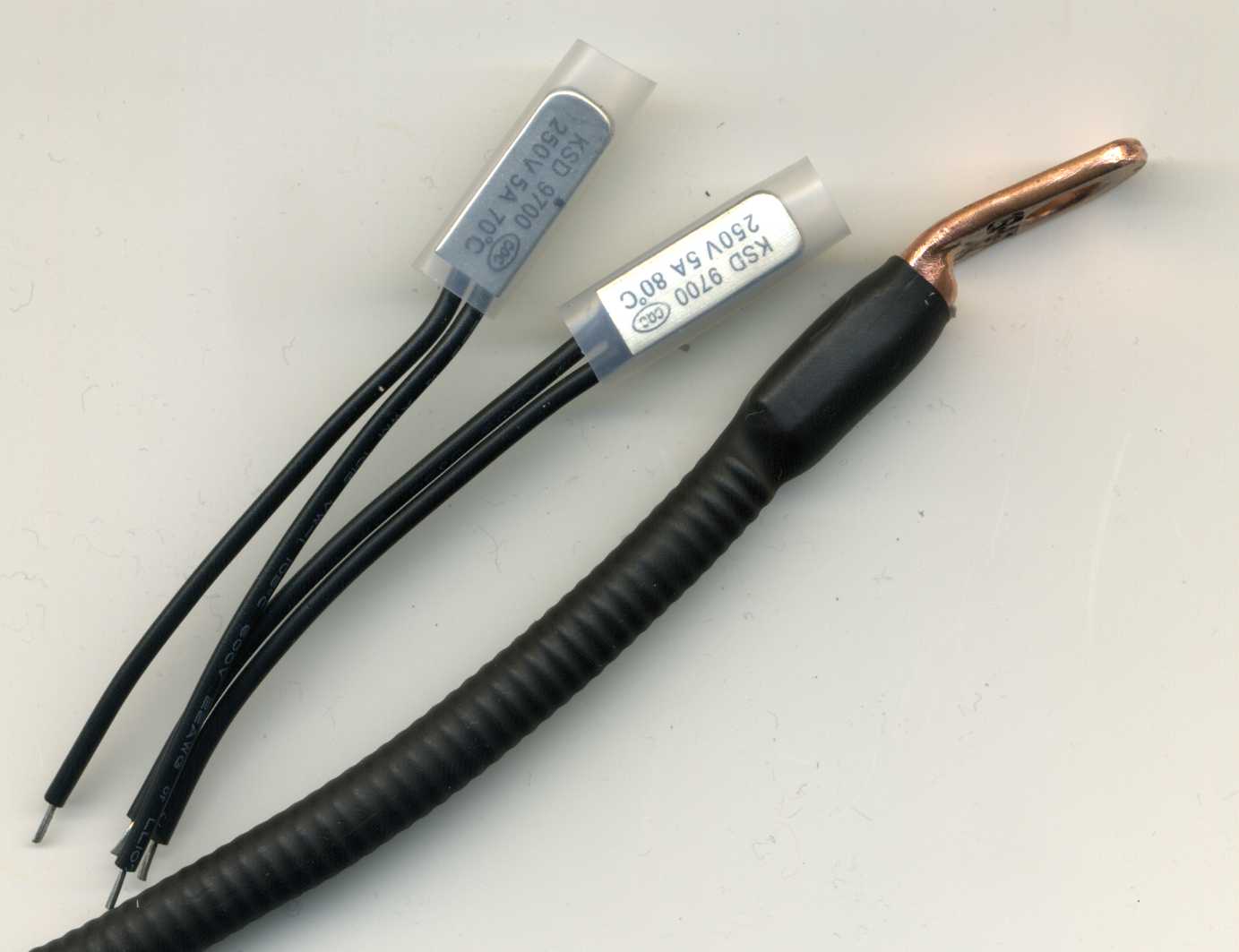 Вставляем такой термостат в медную клемму и крепим на головку двигателя примерно таким образом: