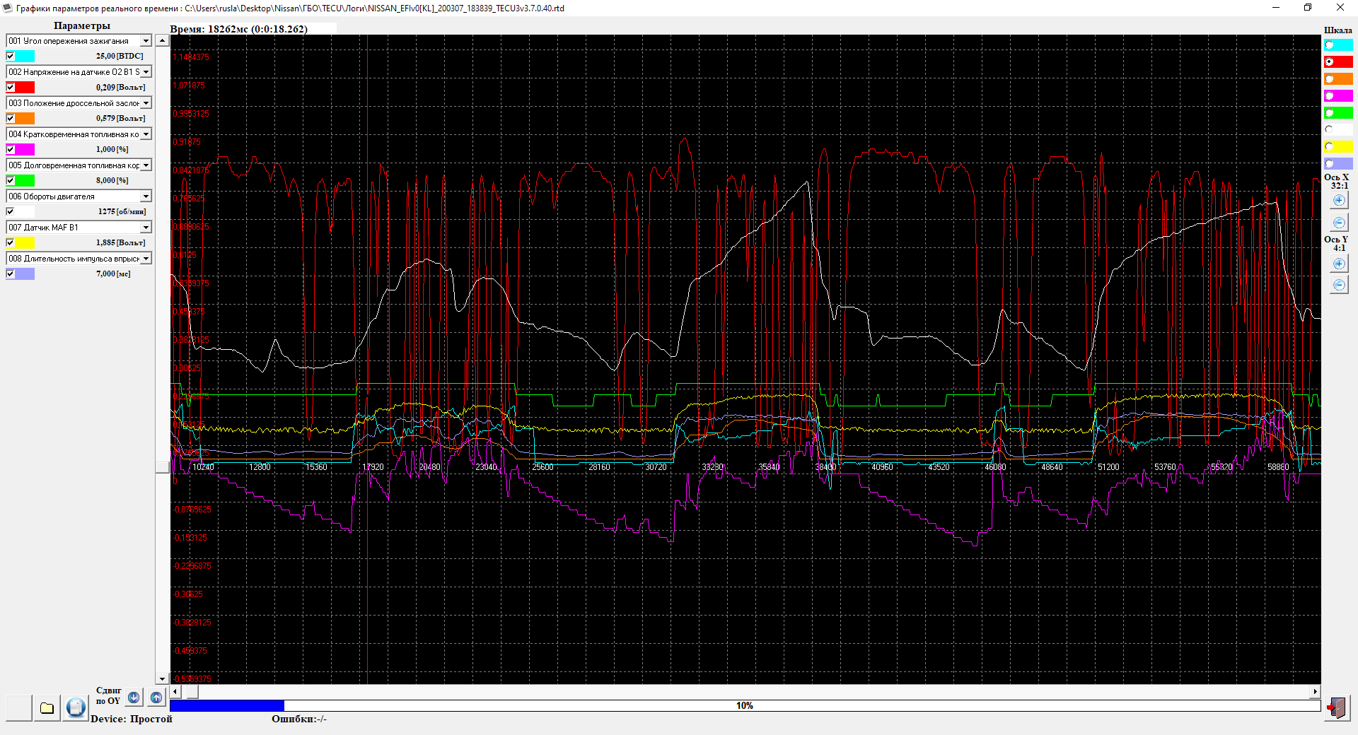 Пока на почту отправил 4 записи сегодня, но это нецелевые записи в режимах, т.е. просто поездки. В теку заметил, что просадка оборотов хх бывает и до 625 после адаптации, но не глох ни разу, т.к. видимо трещина в гофре давала критичный подсос воздуха в обход мафа. Но нужно для точной верификации еще несколько дней/заездов.