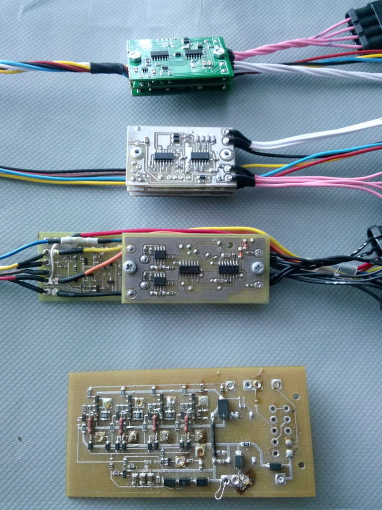 От первого, даже не прототипа, а скорее макета, на котором изучалось взаимодействие с системой управления двигателем, до серийного. Кроме этого макета, который уже полуразобран, остальные все совершенно полноценно работающие варианты. Не показаны еще пара промежуточных вариантов, которые полностью разобраны, все детали переустановлены на более новые версии.