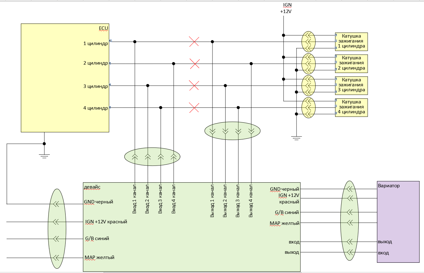 а стала сигнал кв- и рв на ЭБУ без изменений, а вариатор через девайс предметно на- ЭБУ пины катушек . Если так сам ЭБУ вроде как уже не получает обратно связи от катушек и этим управляет ваш девайс с вариатором? Это же отразилось на схеме подключения вариатора?