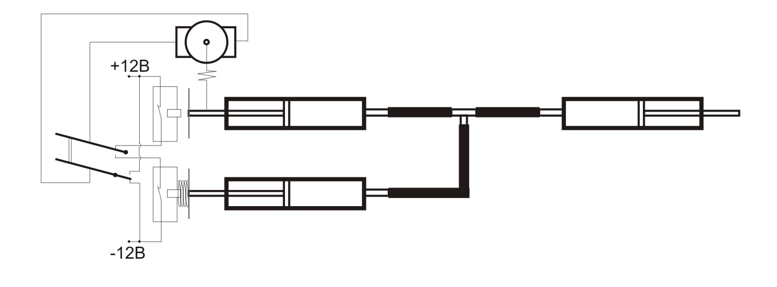 Двигатель обесточен, давление в системе постоянно до тех пор, пока ты выключателем не задействуешь реверс. Ограниченный вторым микро-выключателем, ловящим мертвую точку первого шприца.