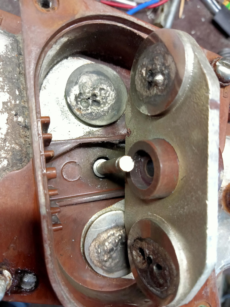 Такую эрозию контактов вижу впервые в жизни. Похоже, что через этот контактор проходил аварийный ток в несколько тысяч ампер. Глубоченные кратеры и ответные им бугры. А серебра в этих контактах 28,5 граммов.