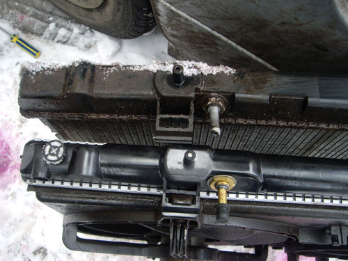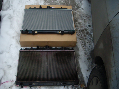 Все потекло, радиатор кондея на выброс, а у китайского отломился тот самый кран для слива и нижний крепеж. Пришлось крепеж приклеить, а краник для слива заменить болтом, нарезав резьбу и на герметик. Да и радиатор чутка попрямил. Так что боевой у меня "китаец".